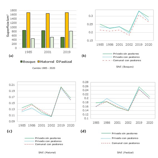 Figura 3. (a) Análisis de cambio en bosque, matorral y pastizal; valores del índice de vegetación SAVI promedio entre 1985 y 2020 bajo tres intensidades de manejo del recurso; (b) Bosques; (c) Matorral; (d) Pastizal.