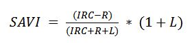 En cada imagen original recortada a los límites del área de estudio, las bandas de R (rojo) e IRC (infrarrojo cercano) de cada fecha se usaron en la generación del índice SAVI, mediante el módulo de Álgebra de Mapas en Quantum GIS© 3.16 (QGIS Development Team, 2020), se generaron los índices de vegetación para cada imagen del satélite (Landsat 1, 2, 5 u 8 según la fecha) y número de la banda (b) del espectro electromagnético correspondiente a las bandas rojo (R) e infrarrojo cercano (IRC) para formular el Índice de Vegetación Ajustado de Suelo. A cada fecha en las imágenes se le aplicó la Fórmula (1) para generar su índice y calcular un valor de índice por fecha, respectivamente.