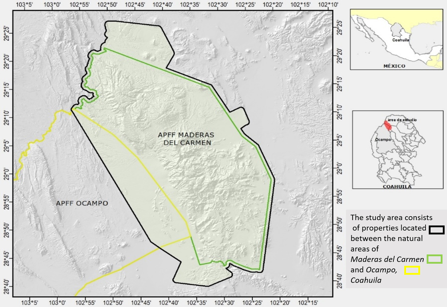 The research was carried out in the area located between Maderas del Carmen and Ocampo Natural Protected Areas, both included in the Wildlife Protection Area (WPA) category (Conanp, 2016). The study area encompasses part of the Acuña, Múzquiz and Ocampo municipalities in the northeast of the state of Coahuila (Figure 1).