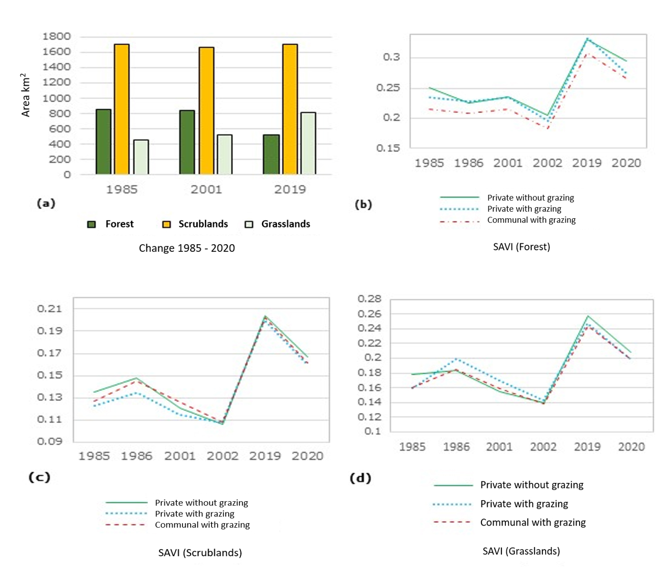 The plots in the scrubland ecosystem exhibited little spatial change in the analyzed period; the range of SAVI values in managed areas with conservation was =0.106–0.203; the private plots with resource management had values of =0.108-0.2, slightly higher than those registered in the conservation areas, and very close to those of the communal lands (=0.108–0.202).