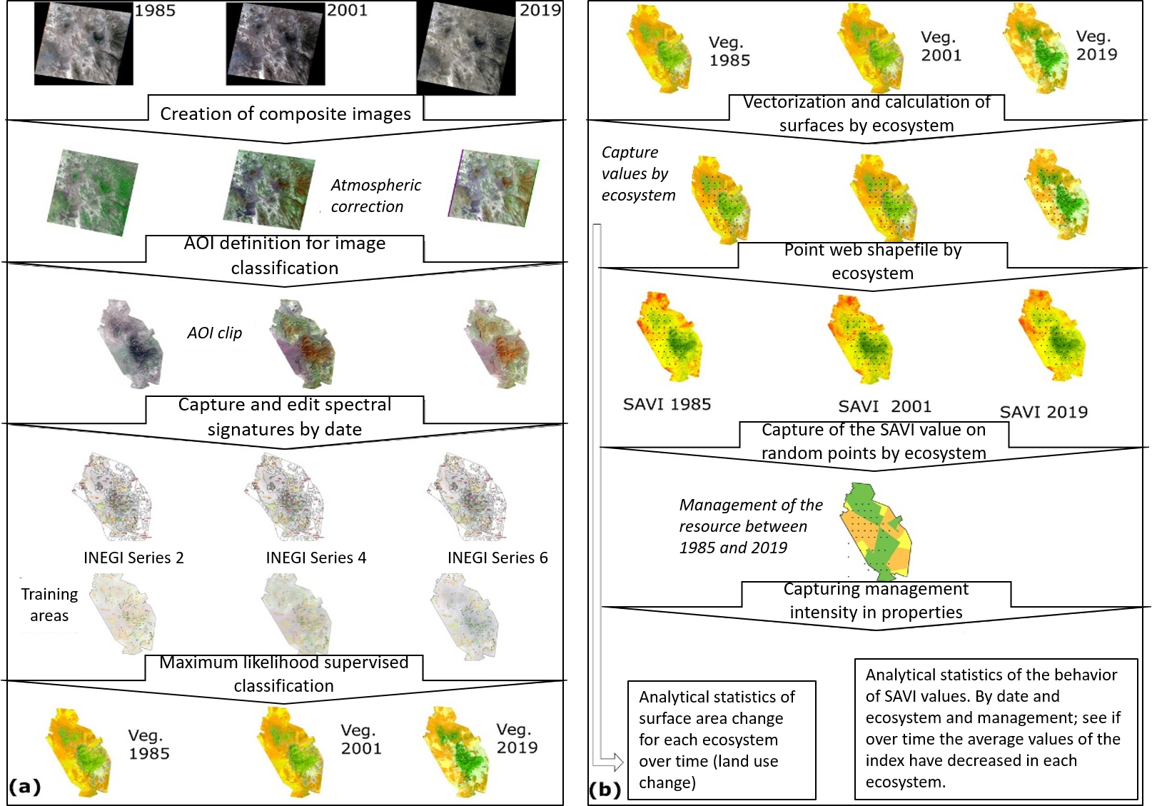 Within the distribution area of the three classified ecosystems, a point type shapefile was made on a grid pattern, systematically divided every 500 m using the Repeating Shapes module for ESRI(Jenness, 2012). The SAVI index values corresponding to the three dates analyzed were captured in the shapefile thus created, and the ecosystem and management regime records were kept using the Extract Multi Values to Point module of ArcGIS 10.8 (ESRI, 2020). Thus, a database of 22 250 records was generated with the UTM coordinate of each specific record in the study area. The base arrangement was organized using the SAVI index values for three dates as the main variable, and the ecosystem factors (forest, scrubland and grassland areas), and a management factor (conservation areas, private areas with traditional management and communal ejido areas with extensive exploitation). The methodological scheme is described in Figures 2a and 2b.