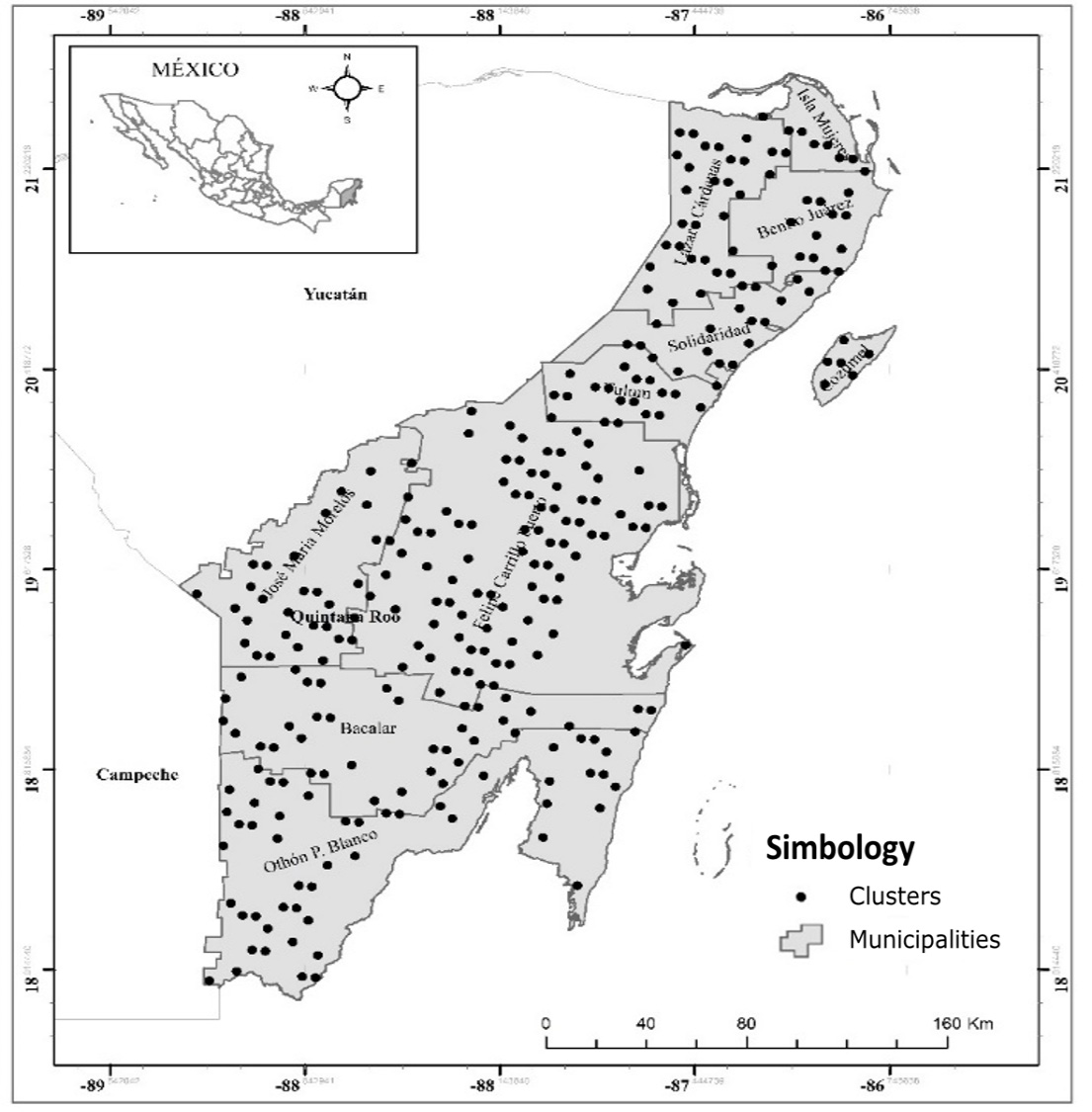 Figure 1. Spatial distribution of the clusters by municipality with the presence of Metopium brownei (Jacq.) Urb. in Quintana Roo, Mexico.