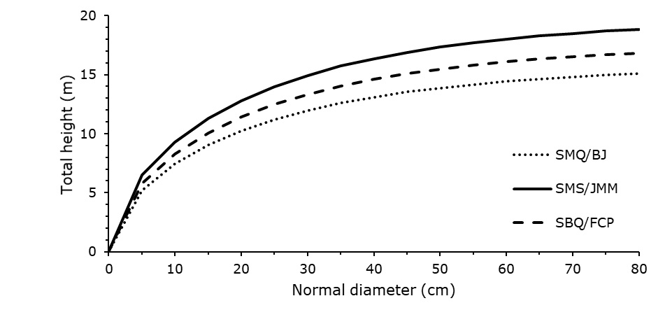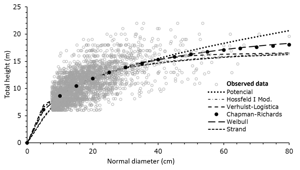 The application of the equations obtained will make it possible to complete the forest inventory databases, in which, due to time and economic logistics, it is not possible to measure the heights of all the trees in the sample.