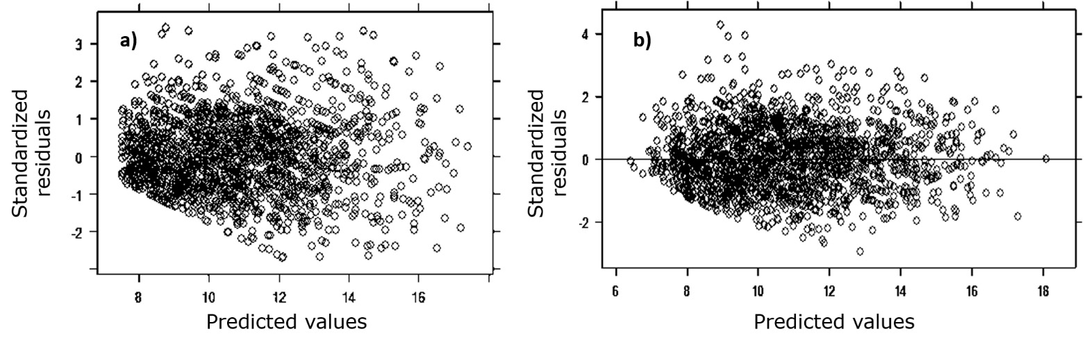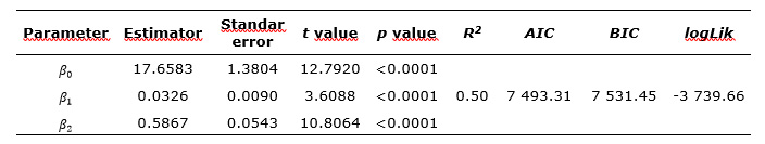 In the adjustment of the local fixed effects equations, parameters significantly different from zero were obtained at a significance level of 5 % in all cases. The R2 values explained between 39 % and 45 % of the variability in the data; the values in the Akaike and Bayesian information criteria varied between 7 688 and 7 901, the average logarithm of likelihood was -3 857 (Table 3).