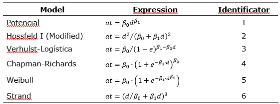 The application of forest management requires knowledge of d and at at the tree and stand level to estimate the existing volumes in the forest masses (Pompa-García et al., 2011). The foregoing is achieved with the use of growth or allometric models that estimate the volume from them (Liu et al., 2017). Therefore, the construction and use of models that describe functional relationships and growth dynamics over time are very useful (Regalado et al., 2008). An allometric model is defined as an equation that quantitatively describes a relationship that allows one tree variable (at, volume or biomass) to be predicted as a function of another, for example, d (Picard et al., 2012).