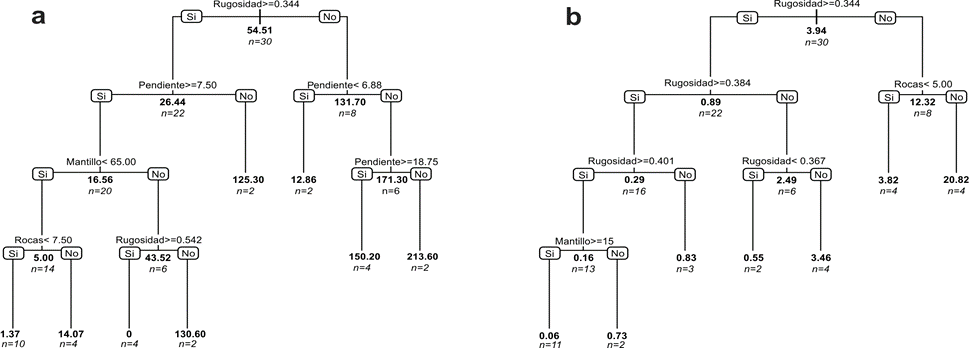 Figure 4. Regression trees to explain: (a) the average runoff rate (bold, mm h-1) and (b) sediment production (bold, g m-2).