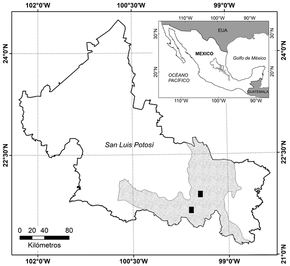 Figure 1. Location of the study sites (black rectangles) within the Ecological Corridor of the Sierra Madre Oriental in the state of San Luis Potosí, Mexico (shaded area).