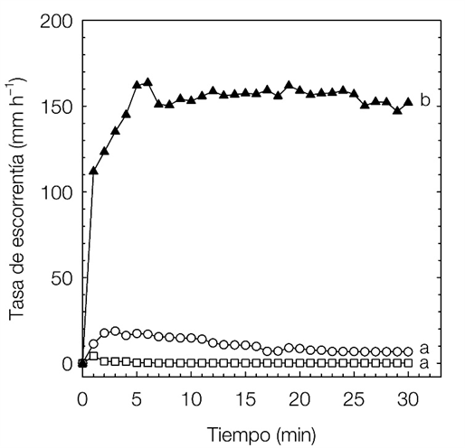 The coverage of herbaceous, mulch and total cover were greater in the unburned plots, in comparison with the plots of moderate and high severity (P <0.005, Table 2). These coverings of herbaceous, mulch and total cover were similar in the plots of moderate and high severity (P> 0.05), and the coverage of rocks was similar among the three post-fire conditions. The slope in the rain simulation plots was similar in the three post-fire conditions (P> 0.05); however, the roughness was greater in the unburned plots, followed in descending order, of the moderate and high severities (P <0.001).