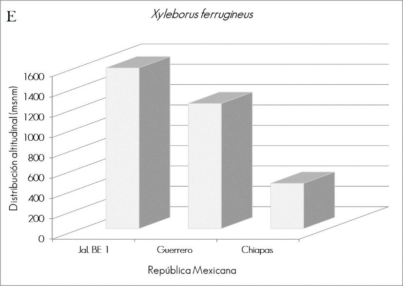 Another species newly registered within this altitude range was Xyleborus ferrugineus, at 1 580 masl (Figure 2-E). Wood (1982) cites this taxon as one of the most destructive in tropical areas, found at an altitude of 500 masl and widely distributed in Jalisco, Chiapas, Guerrero, Nayarit, Oaxaca, Puebla, Quintana Roo, San Luis Potosí, Sinaloa, Sonora and Veracruz, without specifying location or altitudinal distribution. Burgos-Solorio and Equihua (2007) mention its presence in Chamela, Jalisco, at 100 masl, and Atkinson and Equihua (1985) cite it in Guerrero, at 1 230 masl, and in Chiapas, between 640 and 250 masl.