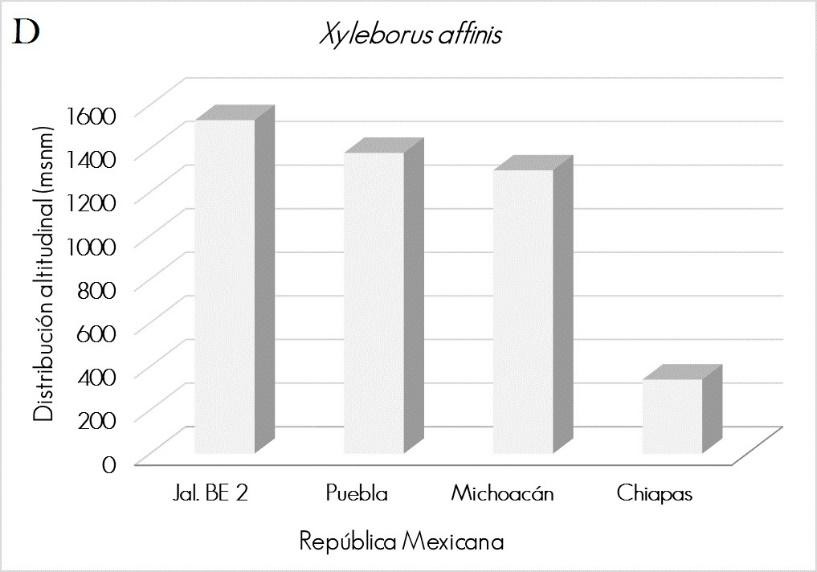 Xyleborus affinis was captured at 1 530 masl and first registered at this altitude (Figure 2D). (Figure 2D). It is distributed in the United States of America (Hawaii), Argentina, tropical Africa and almost all of Mexico (Burgos-Solorio and Equihua, 2007); in Michoacán, at 1 300 masl; in Puebla, at 1 380 masl, and in Chiapas, between 60 and 250 masl. (Atkinson and Equihua, 1985).