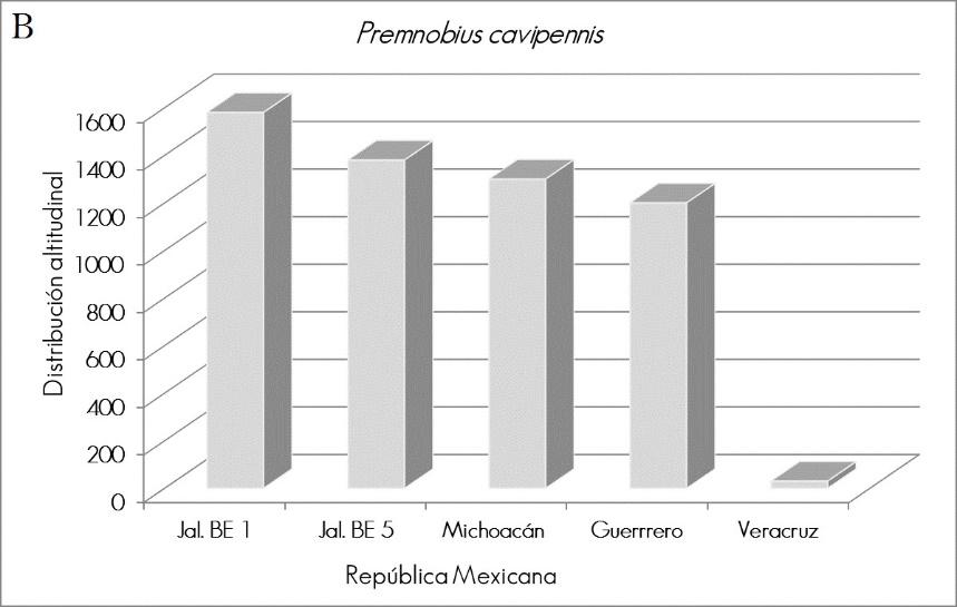 The second species that was new to the state and to the altitude range was Premnobius cavipennis (Figure 2B), captured at an altitude of 1 580 to 1 380 m (Figure 2B). It thrives in Africa, South America (introduced), North America (introduced), the Antilles, Costa Rica, Honduras, the United States of America (Florida) and Mexico (Rabaglia et al., 2006). In Michoacán, is has been located at 1 200 masl, (Atkinson and Equihua, 1985); in Veracruz, at 30 masl. (Wood, 1982); Romero et al. (1997) cite its presence at 60 to 1 600 m, based on reviews of entomological collections. It is a species associated with the tropical forest (Pérez-De la Cruz et al., 2009).