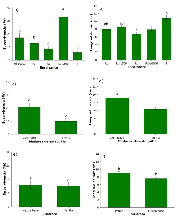 Diferencias estadísticas (p=5.3×10-5) se observaron en la supervivencia por efecto del tipo de enraizante y por la condición de madurez de la estaquilla, situación que no sucedió debido al sustrato (p=0.92). También, se registraron diferencias significativas en el crecimiento de la raíz primaria por efecto de la condición de madurez de las estaquillas (p=2.8×10-9), el tipo de sustrato (p=5×10-4) y el tipo de enraizante (p=0.008).