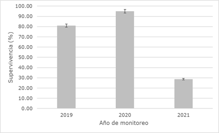 The reforestation annual survival percentage that was measured remained above 80 % during the first two years of establishment due to protection and maintenance efforts, resulting in 80.67 % for 2019 and 95.34 % for 2020. Once the protection and maintenance activities were suspended, a decrease was observed in the evaluated values of 2021 with 28.7 % survival (Figure 3).