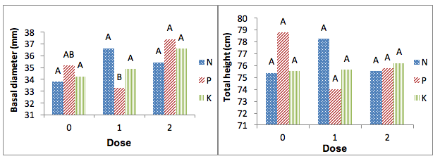 In the case of the total height of 2014, the analysis showed that the tested factors produce no significant effects (Table 3, Figure 1). This may be due to a high variability of the height of the seedlings between experimental units, which in turn were a result of the system of reproduction of the species in the nursery (from seeds), since the germplasm used in the local nurseries generally lacks a strict quality control (Gülcü and Bilir, 2017). Even when there were no significant effects, the Tukey test for the variable total height 2014 exhibited a trend which indicates (Figure 1) that the average dose of N generated the greatest height, i.e., that N is a deficient nutrient, at least partially in this area, as the height of seedlings responded favorably, though not significantly, to its application.