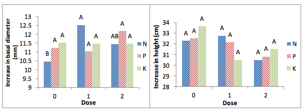 The increment in total height did not significantly differ between the tested factors (nutrients), except in their interactions (Table 6). Only N with dose one exceeded the zero level. The height of the trees is largely variable, and this feature may have been the reason for the confused effects between of the tested treatments. López-López and Flores-Nieves (2016) reported similar results with regard to the increment in height.