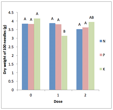 The Tukey test (α=0.05) indicates that the doses of N and P did not have a significant effect on the dry weight of 100 needles (Figure 2). On the other hand, there were differences between doses zero and one of K; of these, the first proved to be the better, i.e. the application of potassium had a negative impact on the growth of needles. This means that potassium is a nutrient found in sufficient quantities in the study site, and its application probably generates an imbalance (excess) with respect to the most deficient nutrients (López-López and Alvarado-López, 2010).