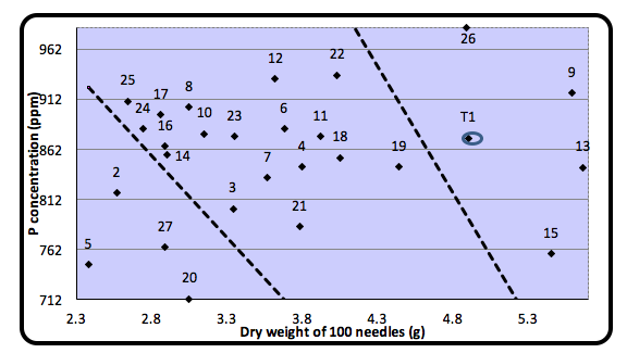 Therefore, the P is a nutrient that determines growth in the study site. This matches the positive effect described for the application of P on basal diameter growth. Consistent with this finding, all treatments that produced higher dry weights of needles than those of the control saplings included a dosis of P (Figure 5), which, according to López-López and Alvarado-López (2010), corresponds to Timmer’s vectors (Timmer and Stone, 1978) such as +,+,+, or +,-,+. López-López and Alvarado-López (2010) point out that this type of vectors is indicative of deficiency of the nutrient before its application.