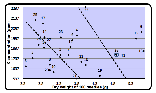 Figure 6. Timmer diagram for the analysis of K in the Pinus cooperi Blanco chemical fertilization experiment in Molinillos, Durango, Dgo.