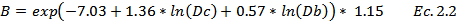 La capacidad predictiva del modelo 2.2 mostró un porcentaje medio absoluto del error de 3.6 %, mientras que la ecuación 3.2, fue de 3.8 %. Por lo tanto, los criterios analizados favorecen a la ecuación 2.2 para estimar la biomasa verde de candelilla. Las estimaciones obtenidas son alternativas para predecir la biomasa de candelilla mediante el uso de la transformación inversa a una escala logarítmica, por lo que se sugiere utilizar la siguiente ecuación para la estimación de biomasa de candelilla en la región de estudio: