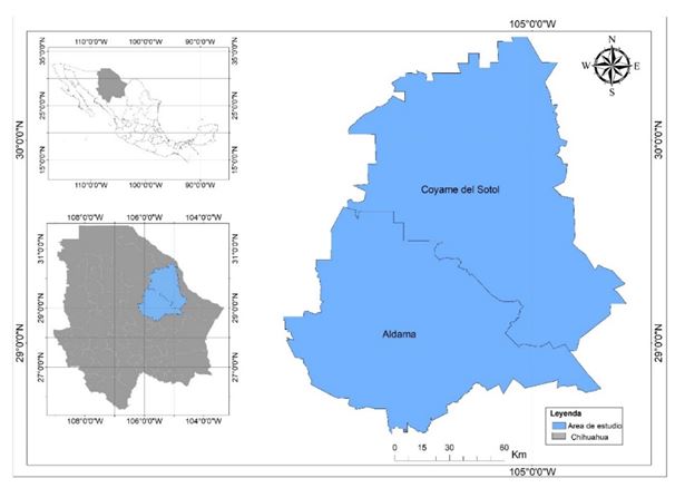 Figura 1. Localización del área de estudio en los municipios Aldama y Coyame del Sotol del estado de Chihuahua, México.
