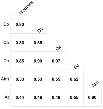 La corrección se realizó con la prueba de Cochrane Orcutt. Al corregir la autocorrelación, se presentaron estimaciones confiables para predecir la biomasa (Cuadro 6). La prueba de Durbin-Watson aumentó 2.19 para las dos ecuaciones seleccionadas. La prueba de Breusch Pagan indicó la ausencia de heterocedasticidad: BP=3.689, valor p=0.15 y BP=3.286, valor p=0.47, ecuación 2.2 y 3.2, respectivamente.