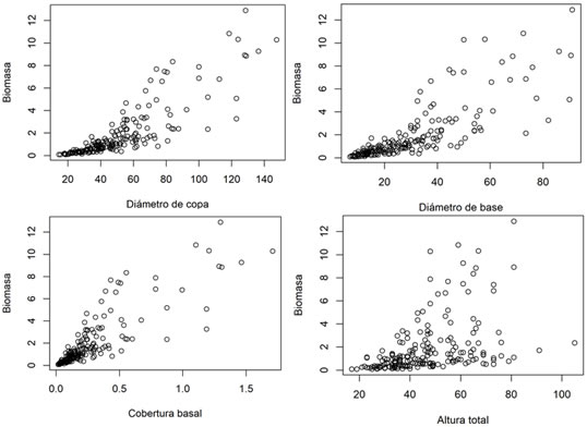 Por ejemplo, Pando-Moreno et al. (2004) probaron varias variables para predecir la biomasa de lechuguilla (Agave lechuguilla Torr.) y determinaron que el volumen del cogollo, como variable independiente, registró mayor coeficiente de correlación contra la biomasa del cogollo. Por su parte, Villavicencio-Gutierrez et al. (2018) identificaron una relación confiable entre el diámetro promedio de copa y el diámetro de base con la biomasa de Lippia graveolens Kunth en las zonas áridas mediante la ecuación de Schumacher y Hall. Sobresale que en las especies arbustivas con formas irregulares, es más necesario realizar un análisis de variables para obtener las que mejor predicen la biomasa y evitar multicolinealidad (Daryanto et al., 2013; Dai et al., 2020).