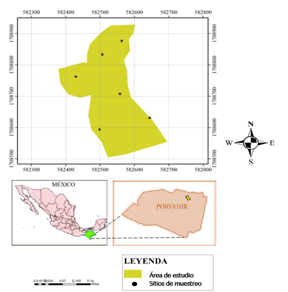 El estudio se realizó en un predio con una superficie de 4 ha de bosque de Pinus-Quercus denominado “parcela escolar Canadá” del ejido Malé, El Porvenir, Chiapas, ubicado en las coordenadas norte 1708786.84 y 1708554.43 y las coordenadas este 582378.81 y 582695.54, a una altitud promedio de 2 840 m (Figura 1).