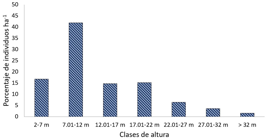 La altura (h) del arbolado registró un porcentaje mayor para la clase de 7.01 a 12 m de altura (41.83 %), similar a lo señalado en otros estudios (Castellanos-Bolaños et al.,2010; García et al.,2019) que se concentran en esta clase dominante del estrato vertical. El menor porcentaje perteneció a la clase >32 m. Las clases 2 a 7 m, 12.01 a 17 m y 17.01 a 22 m tuvieron porcentajes similares (16.73 %, 14.74 % y 15.14 %, respectivamente) (Figura 2).