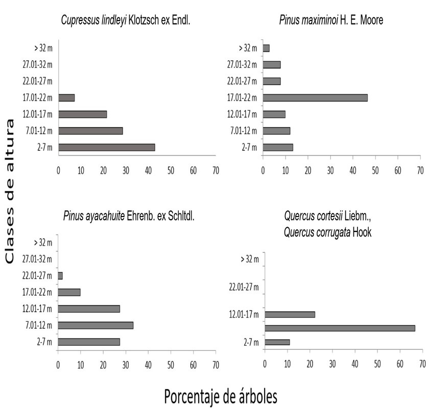 Los porcentajes correspondientes a las clases de altura para cada una de las especies analizadas indicaron que el mayor valor correspondió a Cupressus lindleyi en la clase de 2 a 7 m (42.86 %) y la menor proporción a la clase 17.01 a 22 m (7.14 %). Aunque C. lindleyi puede alcanzar alturas entre 10 y 30 m, incluso hasta 40 m (Raddi et al.,2014), no se observaron árboles con alturas superiores a 22 m. P. ayacahuite tuvo el mayor porcentaje de individuos para la clase de altura de 7.01 a 12 m (33.33 %) y el porcentaje menor se registró en la clase 22.01 a 27 m (9.8 %); de tal forma que, a partir de 27.01 m de altura ya no hubo árboles (Figura 3). Esto difiere con lo citado por Ramírez-Martínez et al. (2018), quienes obtuvieron una media de 27.25 m de altura en un bosque de Pinus ayacahuite de Oaxaca, México, en donde señalan la presencia de árboles con más de 30 m. Pinus maximinoi presentó mayor proporción de individuos para la clase de altura de 17.01 a 22 m (46.48 %), la clase >32 m tuvo el porcentaje más bajo (2.82 %) y las clases 22.01 a 27 m y 27.01 a 32 m tuvieron porcentajes muy similares.
