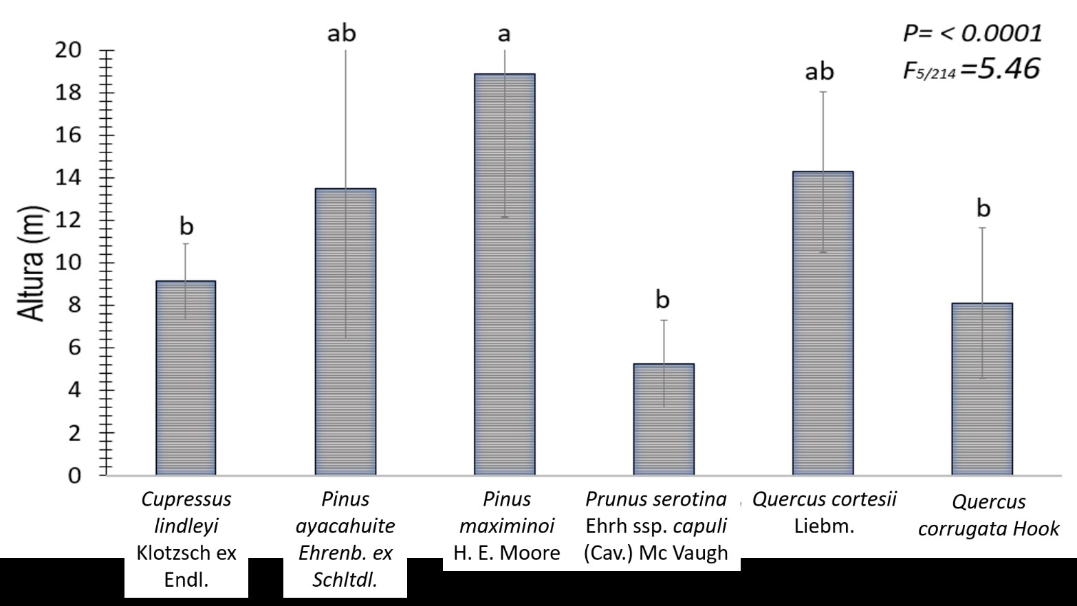 Los resultados del análisis de varianza (ANOVA) indicaron diferencias significativas en la altura promedio de los taxones, con un valor mayor para P. maximinoi (18.88±6.72 m) respecto a Prunus serotina (5.25±2.06 m), Cupressus lindleyi (9.12±1.77 m) y Q. corrugata (8.1±3.55 m) que presentaron las alturas menores (Figura 4).