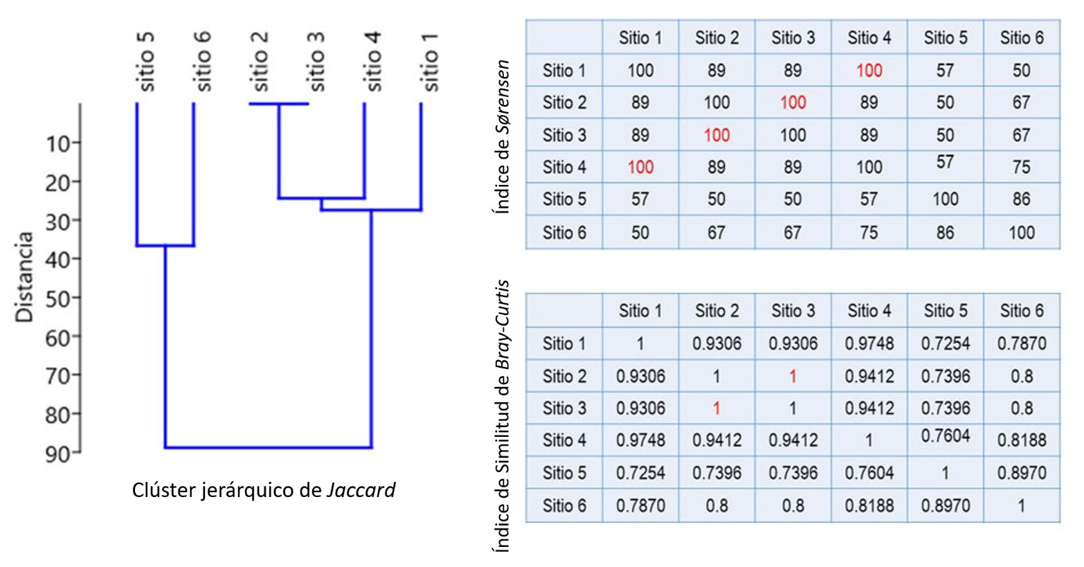 Los análisis estadísticos se realizaron con el software JMP pro 14 (Statistical Analysis System, 2019). Los resultados se analizaron mediante un análisis de varianza (ANOVA) y comparación de medias por Tukey (p<0.05) entre las variables evaluadas en los sitios de estudio. Para contrastar el Coeficiente de Afinidad de Sørensen y corroborar el nivel de igualdad entre sitios respecto a las especies identificadas, se aplicaron los análisis de similitud de Bray-Curtis (1957) y afinidad de Jaccard con el software Past versión 3.2 (Hammer et al., 2001).