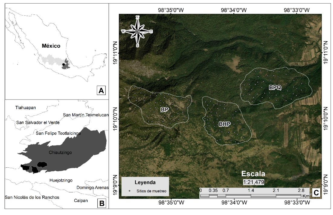Figura 1. a) Ubicación del estado de Puebla, México. b) Municipio Chiautzingo. c) Comunidades forestales arbóreas estudiadas: bosque de pino (BP), bosque de aile-pino (BHP) y bosque de pino-encino (BPQ).