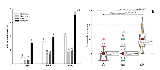 Figura 2. a) Índices de diversidad por comunidad forestal arbórea: BP (bosque de pino), BHP (bosque de aile-pino) y BPQ (bosque de pino-encino). b) Prueba de Kruskal-Wallis para riqueza de especies.