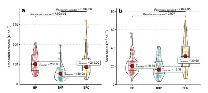 Al aplicar el análisis estadístico para determinar diferencias entre las comunidades arbóreas de bosques templados, se registran diferencias significativas en densidad (BP-BHP, BHP-BPQ), área basal (BP-BPQ, BHP-BPQ) y riqueza de especies (BP-BPQ, BHP-BPQ). A partir del análisis realizado se evidencia la respuesta diferenciada de las comunidades al efecto de las actividades que se llevan a cabo en ellas, en particular en las comunidades de BPQ.