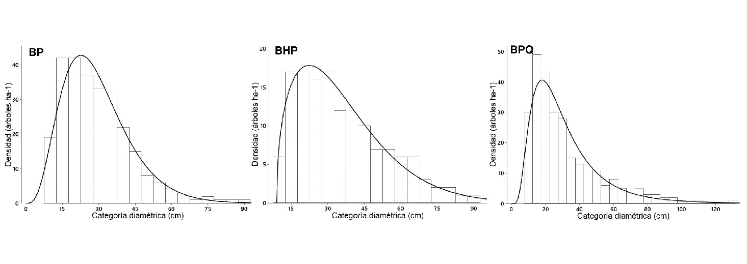Las distribuciones diamétricas de bosques irregulares se han estudiado mediante modelos matemáticos o histogramas con curvas ajustadas través de funciones de densidad de probabilidades (Pond y Froese, 2015). Las distribuciones diamétricas de las tres comunidades arbóreas fueron similares, con mayor número de árboles en las primeras clases, lo que es característico de bosques con intervención antrópica, principalmente por eliminación de árboles grandes con fines comerciales.
