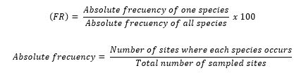 Richness of species was quantified with the Species Richness Index (S) and the diversity indexes: Margalef(Dmg), Simpson (λ), Shannon-Wiener (H’) and Pielou (J') (Table 1) (Magurran, 2004; Moreno, 2001). The calculations were done in R 4.0.3 (R Core Team, 2021) using the Biodiversity package (Kindt and Coe, 2005).