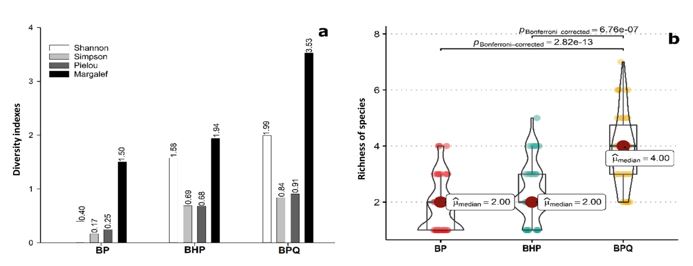 Figure 2. a) Diversity indexes by tree forest community: BP (pine forest), BHP (alder-pine forest) and BPQ (pine-oak forest); b) Kruskal-Wallis test for richness of species.