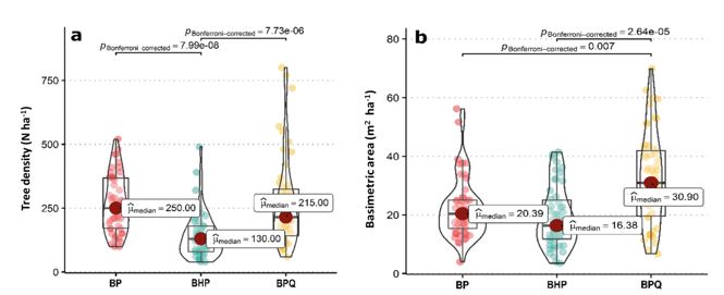 When applying statistical analysis to determine differences between temperate forest tree communities, there are significant differences in density (BP-BHP, BHP-BPQ), basimetric area (BP-BPQ, BHP-BPQ) and species richness (BP-BPQ, BHP-BPQ). Based on the analysis carried out, the differentiated response of the communities to the effect of the activities carried out in them, particularly in the BPQ communities, is evident.