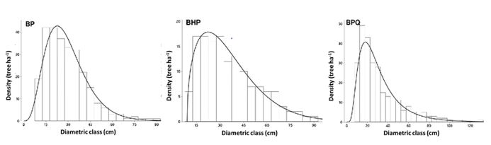 The diameter distributions of patchy forests have been studied using mathematical models or histograms with fitted curves through probability density functions (Pond and Froese, 2015). The diameter distributions of the three tree communities were similar, with a greater number of trees in the first classes, which is characteristic of forests with human intervention, mainly due to the removal of large trees for commercial purposes.