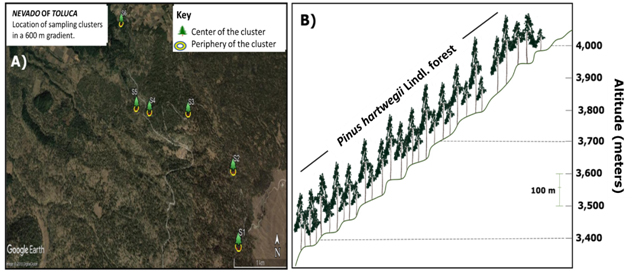 In ordinalr to characterize the tree structure in the Nevado of Toluca WPA along an altitudinal gradient of P. hartwegii forest, an altitudinal elevation of 600 m (3 400-4 000 m) was established using satellite images and contour lines (Figure 1A). Along this gradient, six permanent sampling sites (PSS) were established at every 100 m, similar to those of the National Forest and Soil Inventory (INFyS) (Figure 1B), which is based on systematic stratified sampling (Figure 2). Each PSS consisted of a circular cluster of 1 ha (56.42 m radius) (Figure 2A) comprising four secondary sampling sites (SSS) with a surface area of 400 m2 (11.28 m radius), geometrically arranged in an inverted "Y" shape with respect to the north (Conafor, 2012).