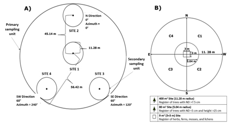 Each SSS was numbered from 1 to 4. SSS 1 was placed in the central part of the cluster (Figure 2A), and the rest (2, 3, and 4), as peripheral to 1. Starting from the center of each site, a circular plot with a surface area of 80 m2 (5.04 m radius) (Figure 2A) and a further plot with a surface area of 9 m2 (3×3 m) were marked to compensate for the slope of the terrain.