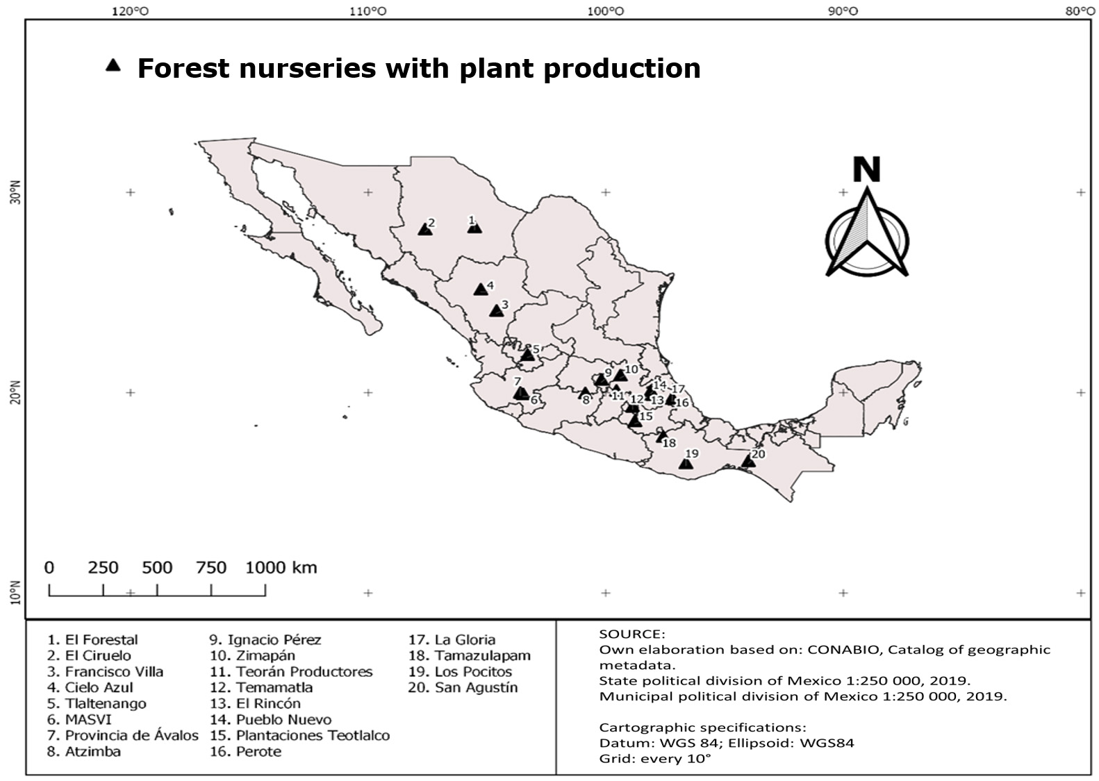 Table 1. Location of forest nurseries in the 2018-2019 production cycle in five regions of Mexico.