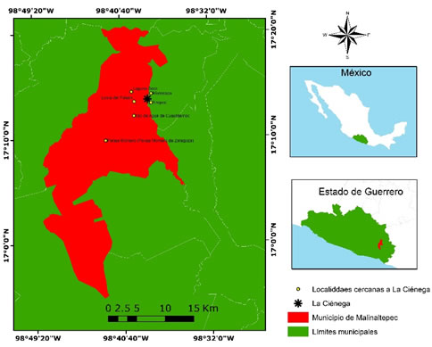 La Ciénega se localiza al oriente del estado de Guerrero, en la región de la Montaña; entre las coordenadas geográficas 17º13’10‟ N y 98º37’34‟ O, a una altitud de 2 050 m (Figura 1). El clima de la comunidad es semicálido A (C) subhúmedo w (w) con lluvias en verano, temperatura media anual entre 18 y 22 °C y una precipitación anual de 1 100 a 2 000 mm (INEGI, 2015).