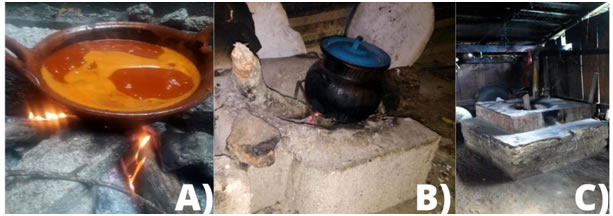 Figura 2. A)Brasero abierto o de tres piedras B) Brasero cerrado o redondo; C) Estufa ahorradora de leña.