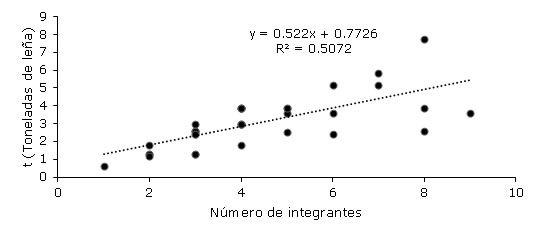 La extracción de leña la realizan dentro de la comunidad, 88.2 % la obtienen de sus propios terrenos y 8.8 % de las áreas comunes. La cantidad recolectada por familia, según las entrevistas, se relaciona con el número de sus integrantes (R = 0.71 y R2 = 0.5072) (Figura 3). En promedio se reúnen 3.0 t de leña por año por familia.