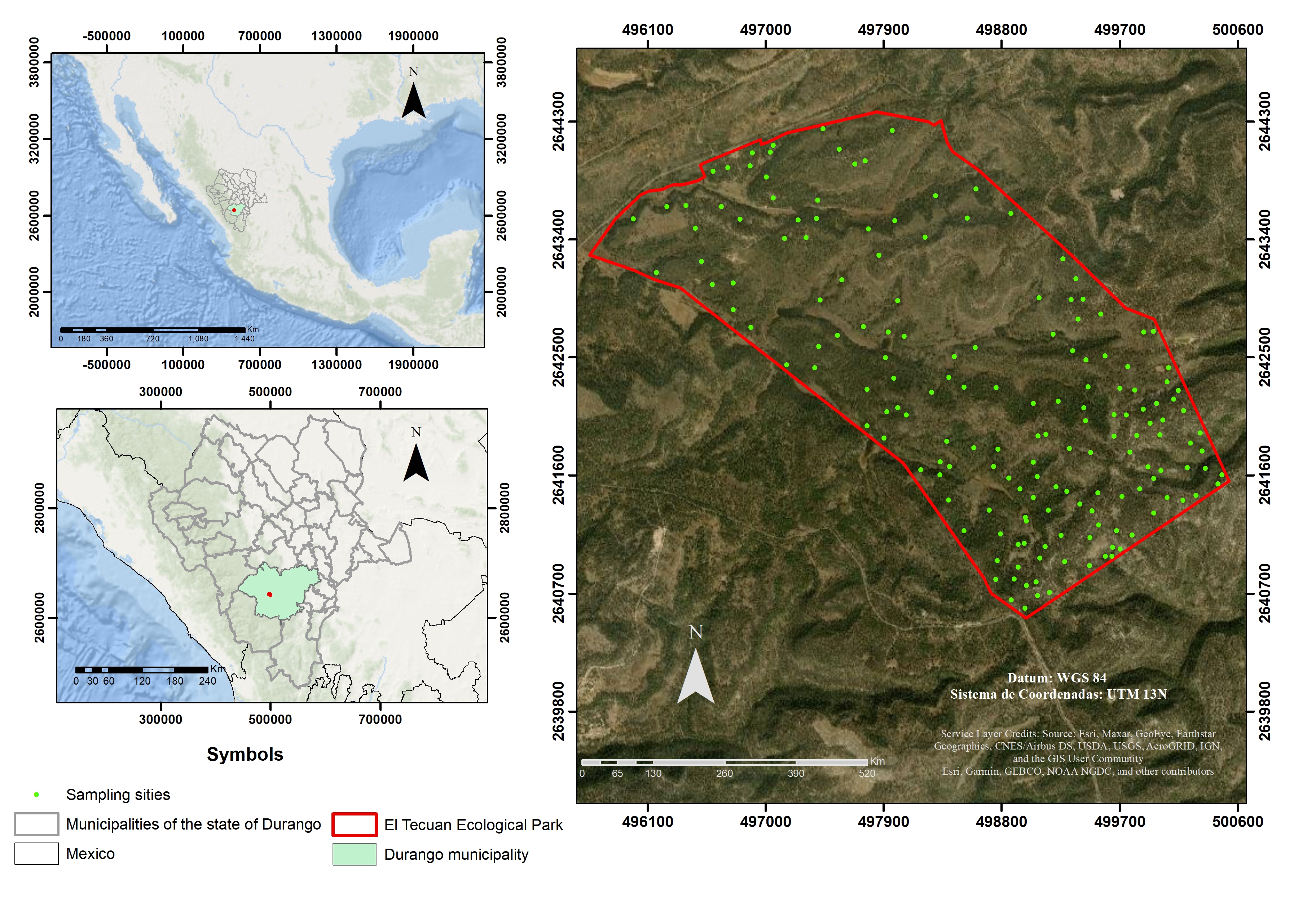 In the state of Durango, there are officially six PNAs and their area adds up to a total of 353 229 ha, equivalent to 2.9 % of the national territory; three are of federal jurisdiction and three of state scope (Rentería et al., 2011). Within the latter, the El Tecuán Ecological Park is located under the administration of the Ministry of Natural Resources and the Environment of the Government of the State of Durango (SRNyMA). This Park represents offers the possibility to carry out actions for the conservation of ecological processes and ecosystem services through the promotion and analysis of knowledge of its natural resources (POGED, 2018). Thus, the objective of this study was to describe the diversity of tree species and their ecological importance in the El Tecuán Ecological Park in the state of Durango, Mexico.