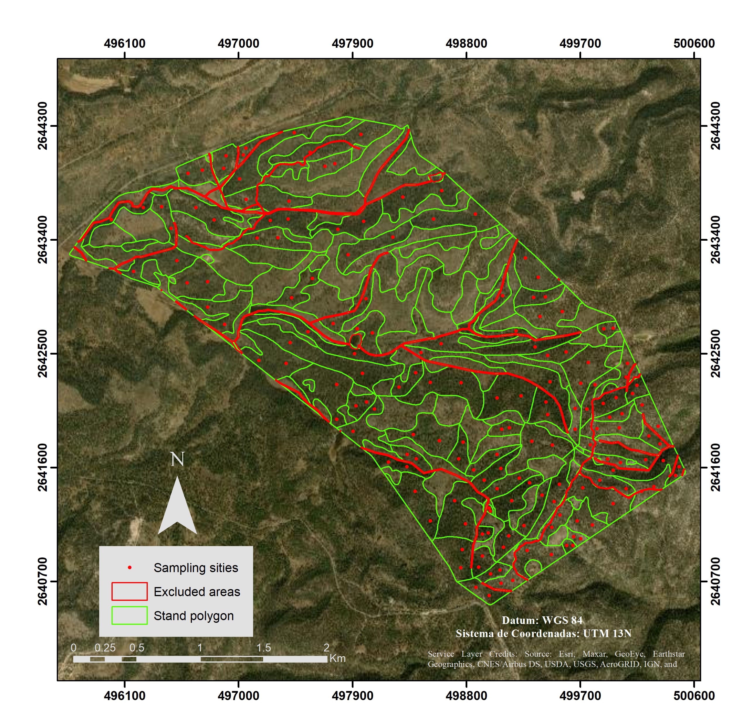 Figure 2. Stand area calculation and sampling sites of El Tecuán Ecological Park.
