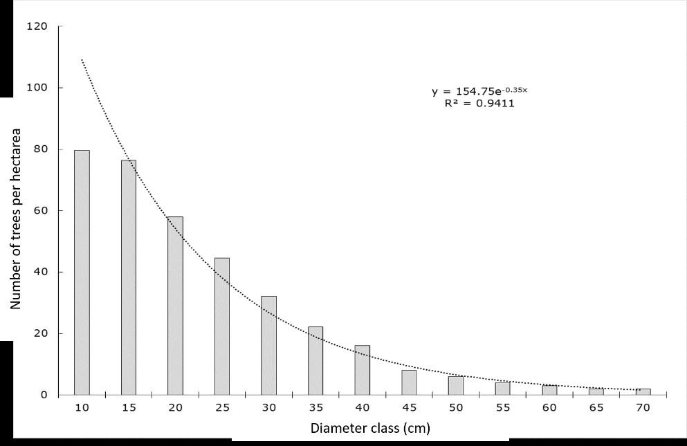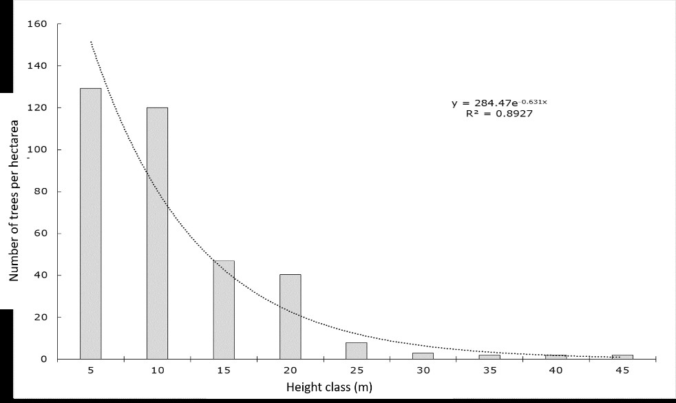 Figure 3 shows the distribution of the number of trees per hectare and by category of diameter and height. It is observed that in both variables the distributions fit an inverted-J or negative exponential type. This type is frequently observed in forests under an irregular management scheme, as is the case of the mixed and irregular forests of the Sierra Madre Occidental (Návar-Cháidez y González-Elizondo et al., 2009). Likewise, they have been described in many forests in protected status throughout the world. For this reason, it is considered as the structure that represents the ideal number of trees per diameter class for a given basal area, and, therefore, it is used as a reference when developing forest management methods with selective felling or continuous cutting cover (Buongiorno and Michie, 1980).