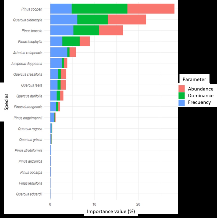 The estimated species diversity with the Shannon index was 1.89, which suggests that species diversity in the study area is medium to high. This index is higher than that of Méndez et al. (2018) who observed a richness of five species and an index of 0.78 in a similar forest in the Sierra Madre del Sur. Likewise, Graciano-Ávila et al. (2017) recorded a Shannon index of 1.81 and a richness of 13 species in a mixed pine-oak forest under management for the El Salto region in the state of Durango. The greater species richness and the similarity between the diversity value of this study and the value reported by Graciano-Ávila et al. (2017) could be attributed, among other reasons, to the fact that the park's forest, despite being located in an area with less forest potential, is protected from timber harvesting, extensive livestock farming and different anthropogenic activities that could affect the diversity of species.