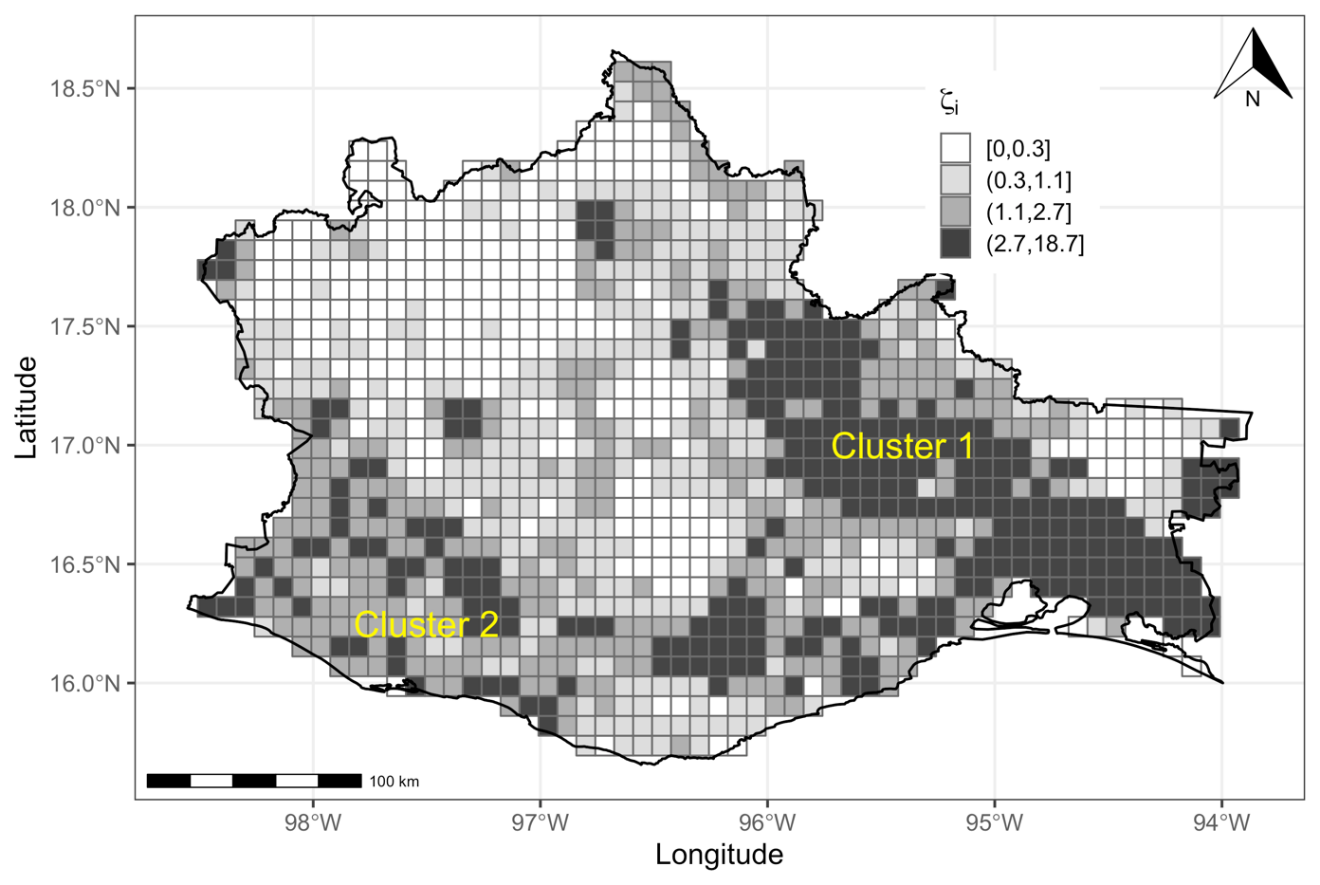 The second cluster goes from the southwest (adjoining the state of Guerrero) to the southeast of the state, an area that comprises the Sierra Madre del Sur. This region is made up of dry, warm forests and temperate mountain ranges, and probably high values of the main spatial effect are also due to the anthropogenic impacts. Both clusters identified in this study were also identified by Zúñiga-Vásquez et al. (2017), integrating data for the whole Mexican territory.